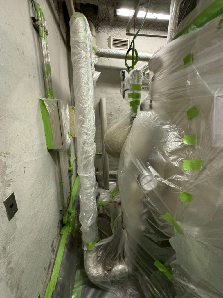 工事履歴 某ビル アスベストLv1封じ込め工事 某ビルの機械室内での作業です。ご覧の通り狭くてやり辛い(; ・`д・´) これが高層ビルなもんだから25階から3階まで・・・。スタッフもかなり大変だったようです・・・。ごめんね大変な思いさせて・・・。でも誰かがやらなきゃいけないならウチでやろうよって思ってしまう私なんです(;’∀’)